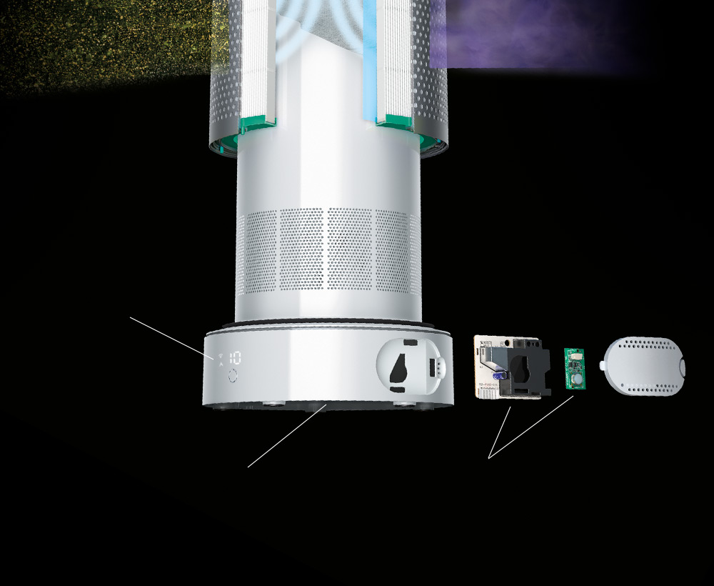 내장된 센서들이 공기를 모니터링하고 먼지와 오염물질을 감시합니다.